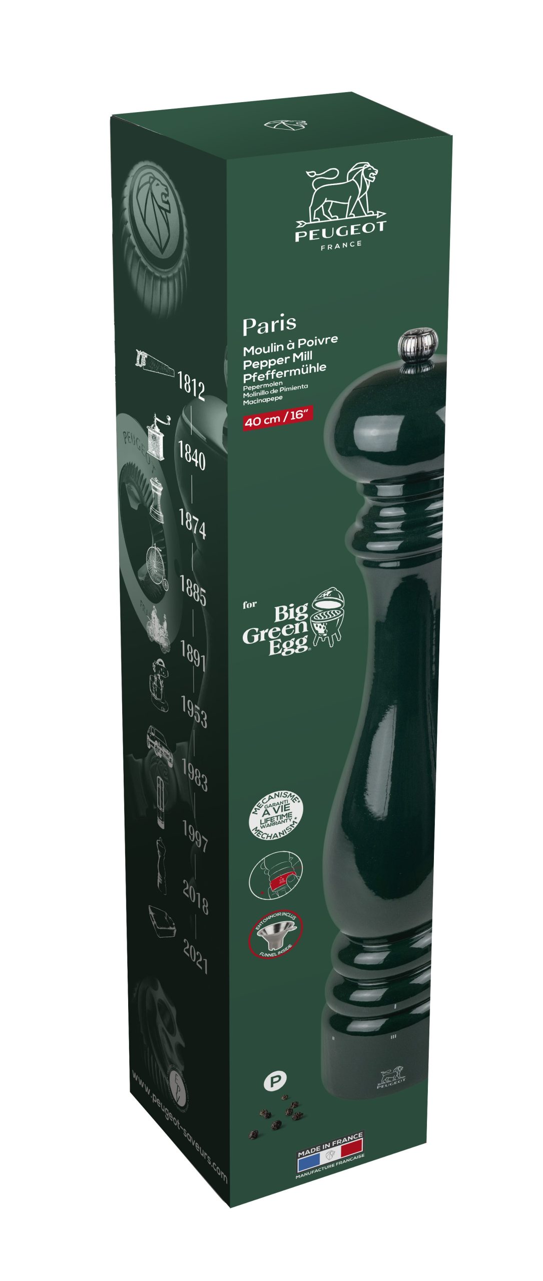 Doté de 6 moutures pré-réglées, il est vendu avec son entonnoir en inox pour faciliter le remplissage du moulin, et est accompagné d'un livret qui présente une recette originale Big Green Egg. Moulin en bois, mécanisme garanti à vie.