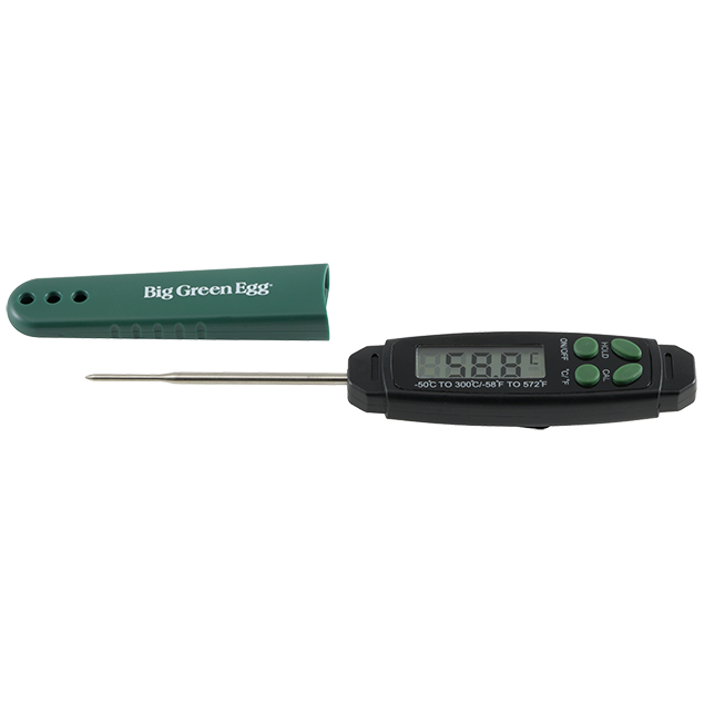 Le thermomètre numérique à lecture rapide Big Green Egg est petit et compact, idéal pour vérifier vite et facilement si votre pièce de gibier est cuite à point ! Il s'éteint automatiquement au bout de 5 minutes afin d'économiser les piles (qui sont d'ailleurs fournies, histoire de vous simplifier encore plus la vie).