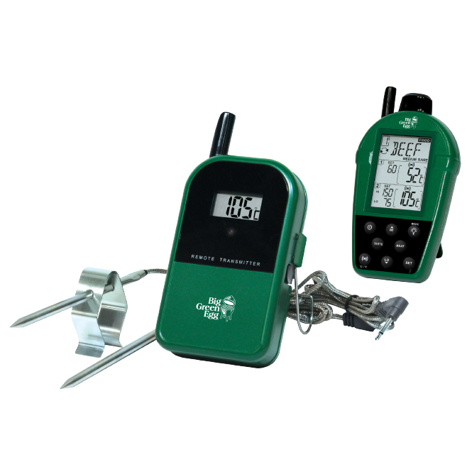 Parce que mesurer est indispensable pour bien cuisiner. Ce thermomètre digital (Dual Probe Remote Thermometer) et sans fil vous permet de mesurer simultanément et au degré près la température à cœur des ingrédients cuisinés ainsi que la température à l'intérieur du dôme de l'EGG. Le thermomètre fonctionne avec deux sondes et un récepteur que vous pouvez conserver avec vous. Une fois la température souhaitée atteinte, le récepteur émet automatiquement un signal (portée maximale de 91 mètres)